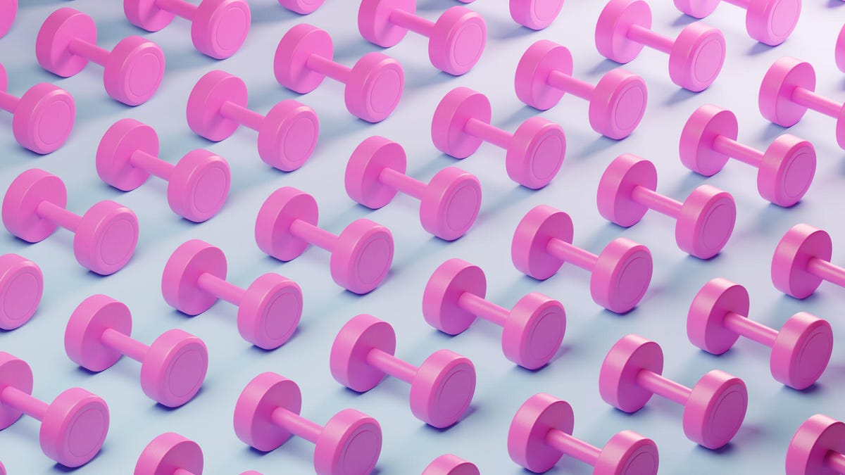 An image showing a series of pink dumbells laid out on a white background (gettyimages-1886169763)