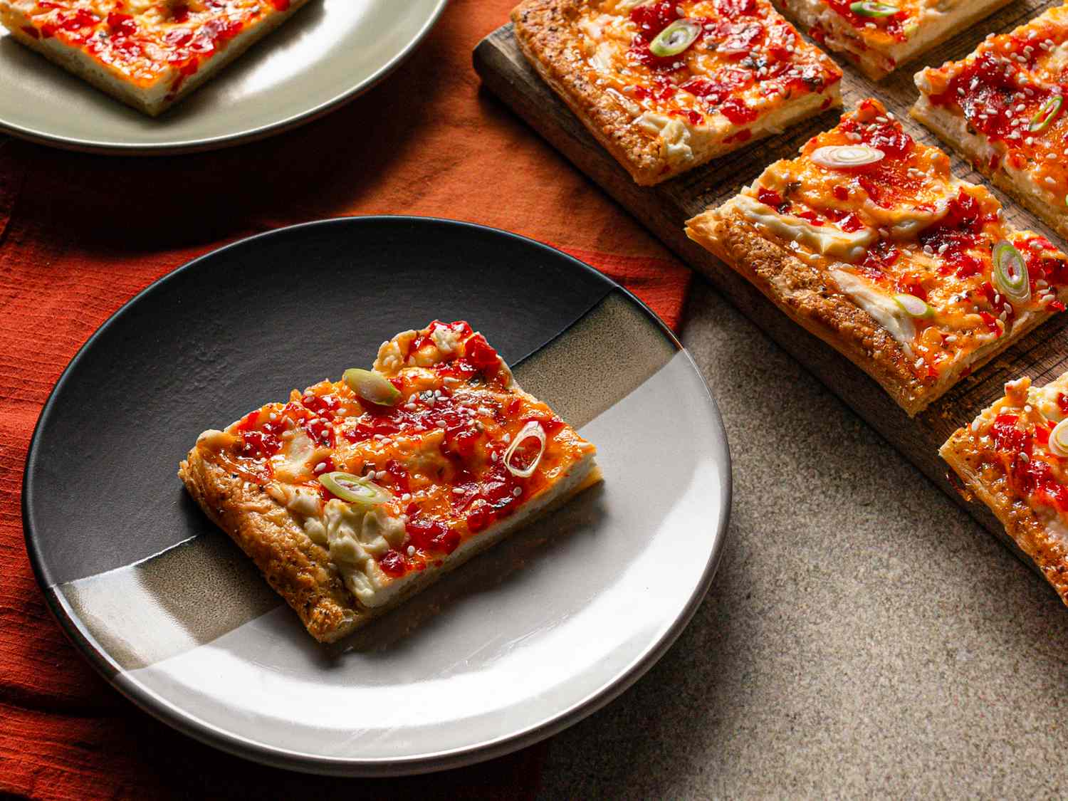 The second version was far more successful: spreading the cream cheese and pepper jelly onto a raw sheet of puff pastry before baking. The result is a more sophisticated tart, both visually and texturally. The cream cheese firms up slightly in the oven, while the pepper jelly thickens and intensifies in flavor. Scoring the edges creates a border that rises above the center, which I chose to season with salt and pepper for additional flavor.