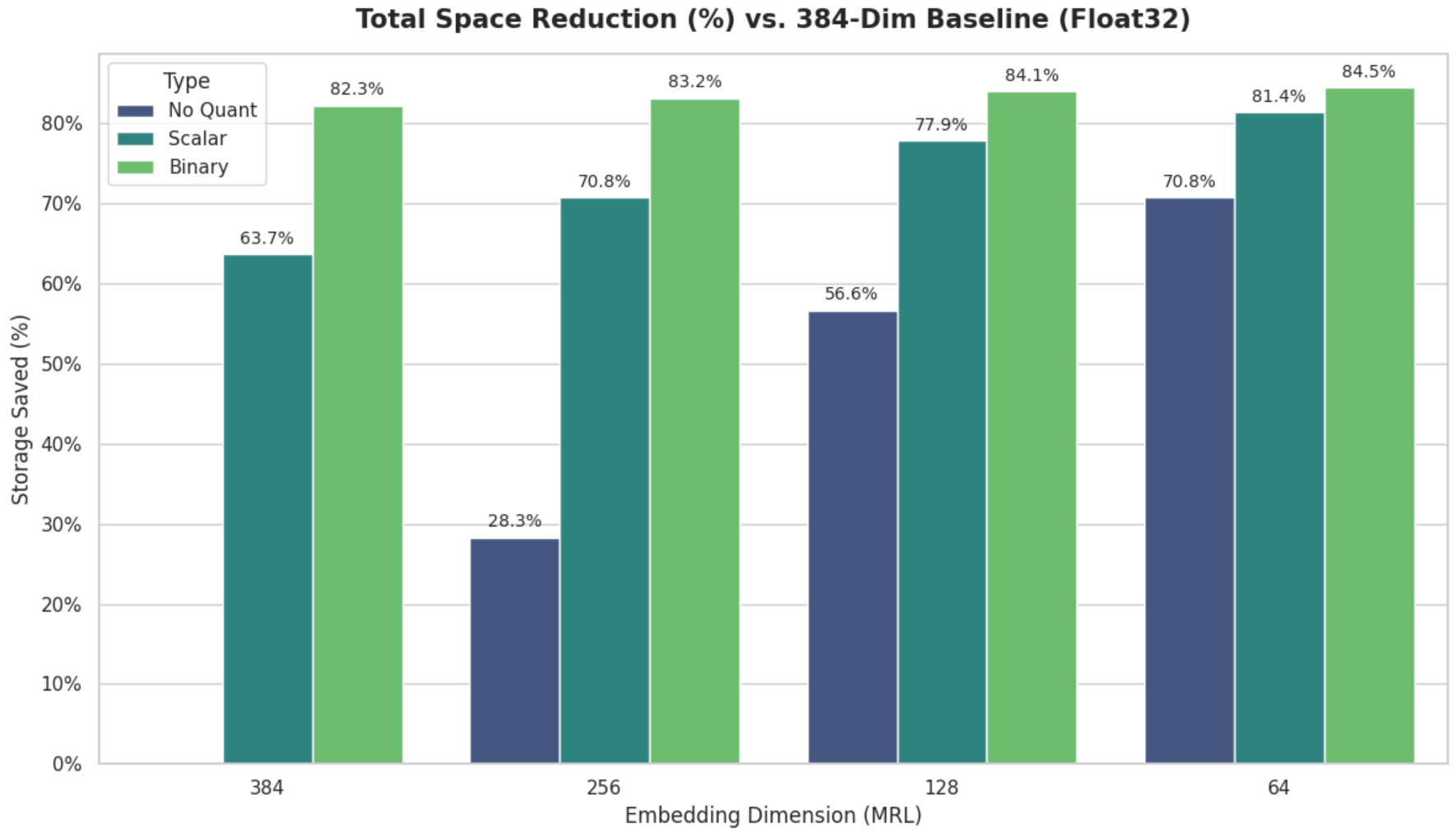 Finally, Binary Quantization: As expected, it provides the most extreme space reductions but suffers from a massive drop in retrieval metrics. As a result, it is much more beneficial to apply MRL plus Scalar Quantization to achieve comparable space reduction with a minimal trade-off in accuracy. Based on the experiment, it is highly preferable to utilize lower dimensionality (128d) with Scalar Quantization—yielding a 77.9% space reduction—rather than using Binary Quantization on the unshortened 384-dimensional index, as the former demonstrates significantly higher retrieval quality.