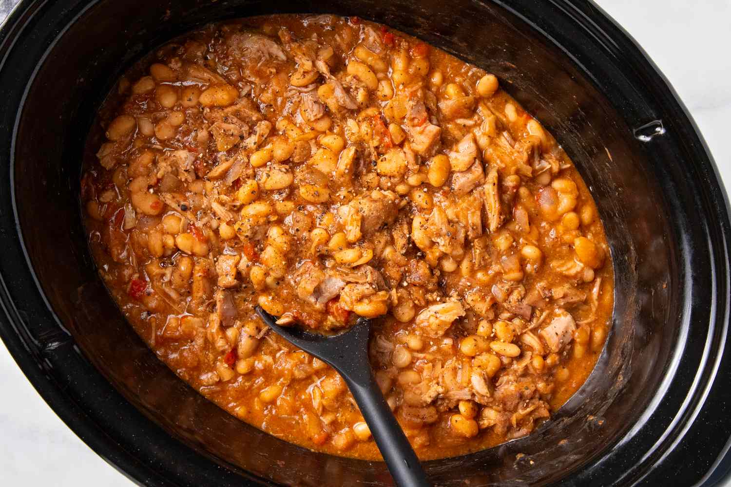 To remedy this, I soak my beans overnight and cook them in a slow cooker without the acidic ingredients. Once the beans are tender, I remove most of the cooking liquid. Then I add barbecue sauce and simmer the beans on high to help the ingredients meld together.
