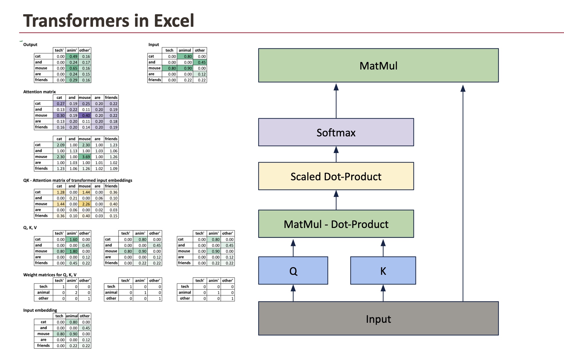 Because the attention matrix depends on Q and K, it is partially interpretable. We can inspect which words attend to which others and observe patterns that often align with syntax or semantics.