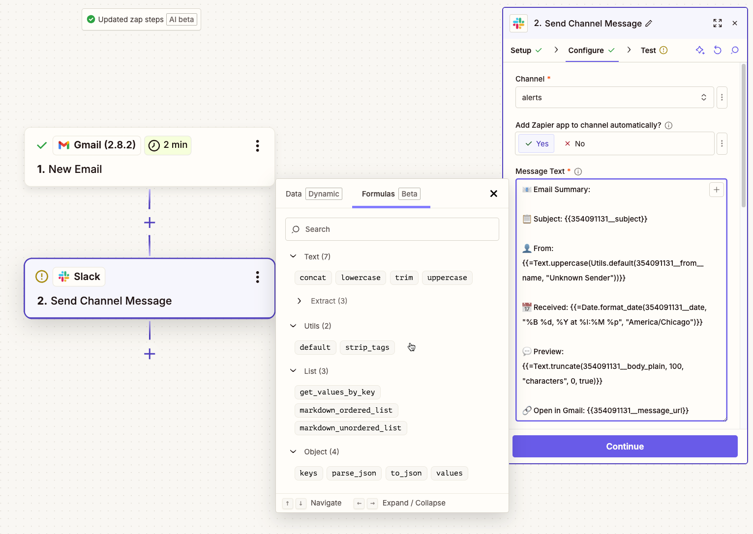 Inline Formulas let you handle lightweight transformations directly inside your existing Zap steps. Trim text, extract emails, combine fields, parse JSON, and more—right where you’re mapping data. No extra steps. No context switching. Just streamlined workflows.